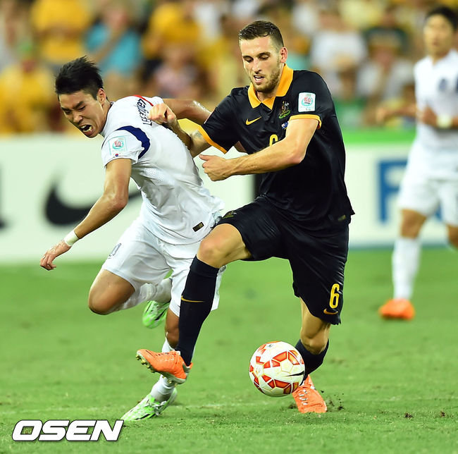 17일 오후(이하 한국시간) 호주 브리즈번 스타디움에서 2015 AFC 호주 아시안컵대회 조별리그 최종전 한국과 호주의 경기, 후반 이정협이 호주 스피라노비치에게 반칙을 얻어내고 있다.