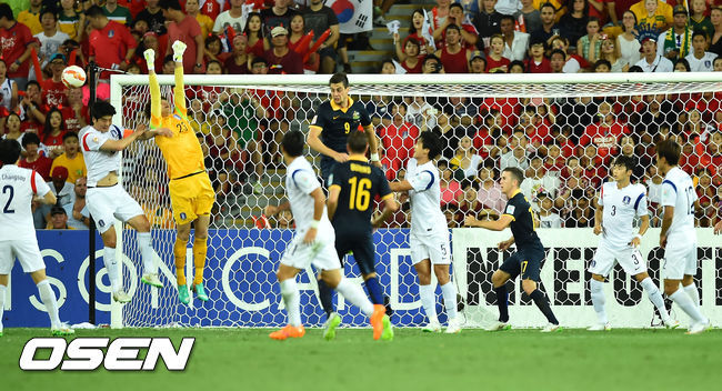 전반 2분 만에 코너킥을 만들어낸 한국은 초반 호주와 팽팽한 접전을 펼쳤다. 전반 15분 다시 한 번 맞은 코너킥 상황에서 김진수가 올린 크로스가 곽태휘의 머리에 정확히 맞았으나 골대를 빗겨나갔다.