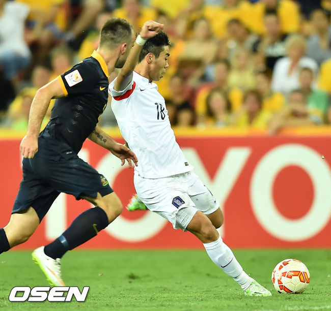 17일 오후(이하 한국시간) 호주 브리즈번 스타디움에서 2015 AFC 호주 아시안컵대회 조별리그 최종전 한국과 호주의 경기, 후반 이정협이 중거리슛을 시도하고 있다.