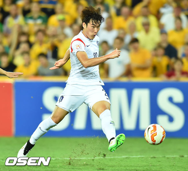 17일 오후(이하 한국시간) 호주 브리즈번 스타디움에서 2015 AFC 호주 아시안컵대회 조별리그 최종전 한국과 호주의 경기, 후반 장현수가 슛을 시도하고 있다.