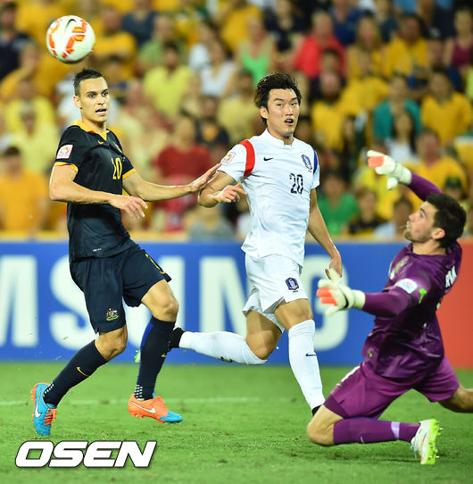 17일 오후(이하 한국시간) 호주 브리즈번 스타디움에서 2015 AFC 호주 아시안컵대회 조별리그 최종전 한국과 호주의 경기, 후반 장현수가 골찬스를 놓치고 있다.