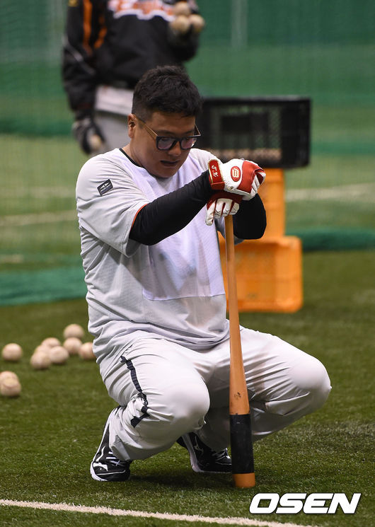 한화 김태균이 타격 훈련 중 휴식을 취하고 있다.