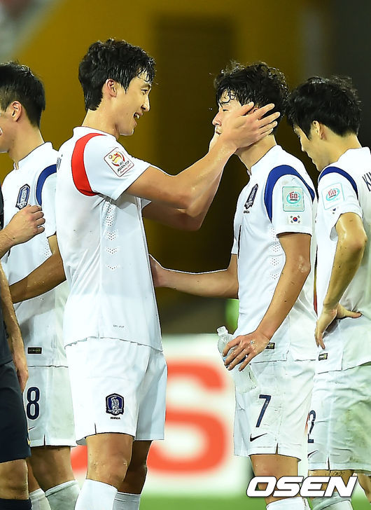경기를 마치고 곽태휘가 손흥민과 승리의 기쁨을 나누고 있다. / rumi@osen.co.kr