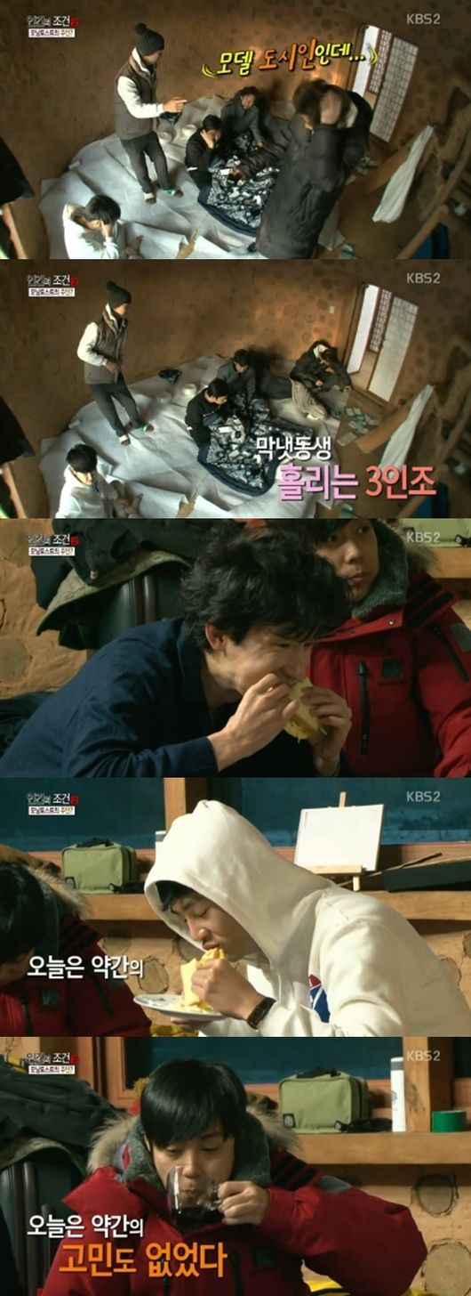 이날 제작진은 토스트 하나와 커피 한 잔을 문 앞에 뒀다. 이는 일찍 일어난 멤버만 누릴 수 있는 혜택. 이에 은지원 봉태규 허태희가 일어나 토스트와 커피를 나눠 먹고, 빈접시를 치우며 아무 것도 먹지 않은 척 연기했다.