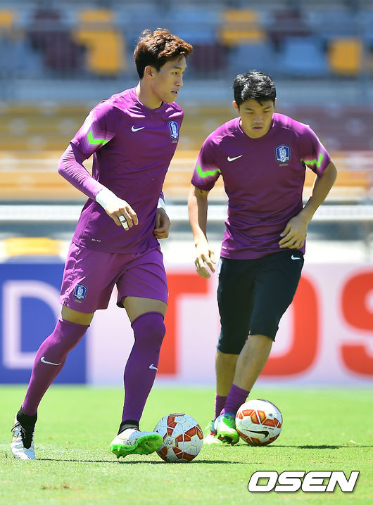 18일 오전 (이하 한국시간) 호주 브리즈번 퀸슬랜드 스포츠&애틀레틱 센터에서 2015 AFC 호주 아시안컵대회 한국대표팀이 예선 3차전 호주와의 경기를 마친 다음날 회복훈련을 가졌다. 김승규와 정성룡이 드리블 훈련을 하고 있다.