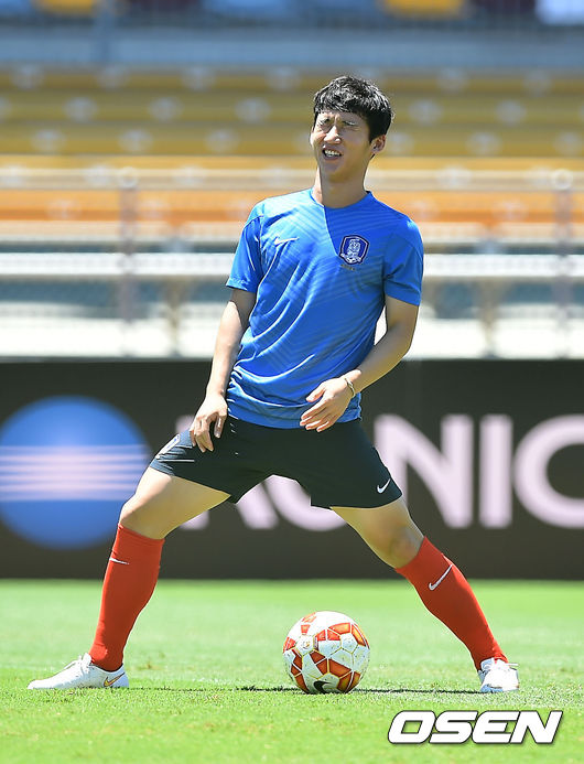 18일 오전 (이하 한국시간) 호주 브리즈번 퀸슬랜드 스포츠&애틀레틱 센터에서 2015 AFC 호주 아시안컵대회 한국대표팀이 예선 3차전 호주와의 경기를 마친 다음날 회복훈련을 가졌다. 김민우가 훈련을 하며 얼굴을 찡그리고 있다.