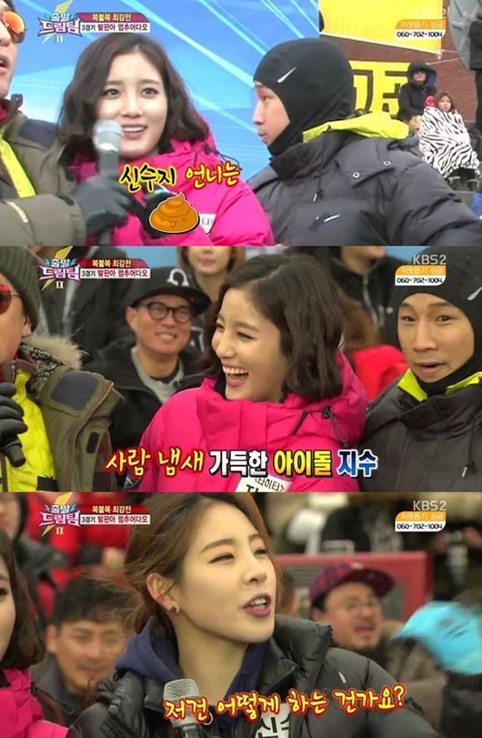 지수는 18일 오후 방송된 KBS 2TV ‘출발 드림팀 시즌2(이하 ’드림팀2‘)’에서 “신수지 언니는 지금 똥 싸고 있다”고 말해 눈길을 끌었다.