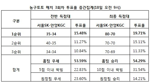 원정팀 KGC의 승리에 투표한 농구팬이 14.21%로 집계됐고, 나머지 31.54%는 양팀의 박빙승부를 전망했다.
