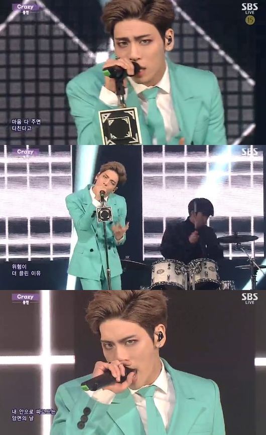 종현은 18일 오후 방송된 SBS '인기가요'에서 곡 '크레이지'의 무대를 선보였다.