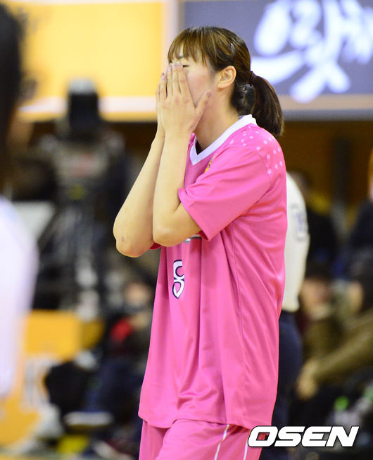 박혜진이 3점슛 콘테스트에서 우승을 놓친 뒤 아쉬워하고 있다. 박하나는 박혜진을 제치고 우승을 차지했다.