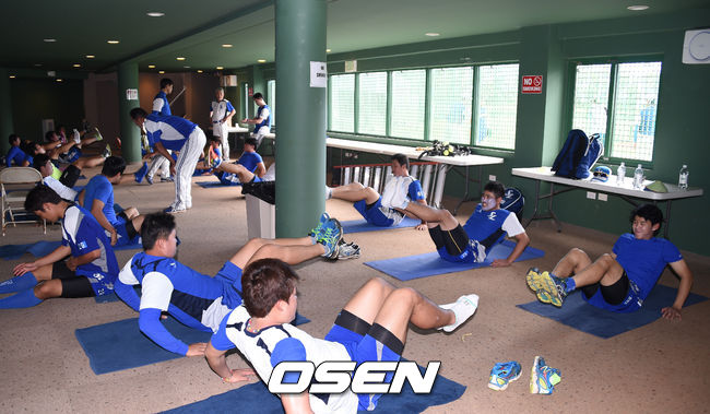 삼성 투수 선수들이 실내에 마련된 공간에서 복근 강화 훈련을 하고 있다.