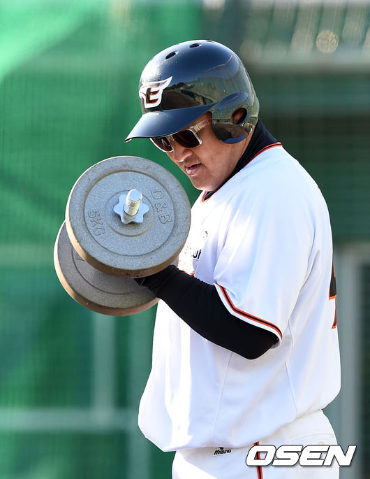 한화 조인성이 아령을 이용해 훈련을 하고 있다.