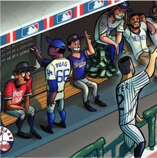 미 언론들은 이 그림이 벌을 받는 장면을 패러디한 그림이라고 소개했다. 미국의 인기만화인 ‘심슨 시리즈’의 주인공 중 하나인 바트가 학교에서 벌을 받는 장면에서 이런 그림이 나온다는 것이다. 바트는 만화에서 미워할 수 없는 악동으로 나온다. 푸이그도 자신이 그런 처지에 있음을 인정한 것이다.