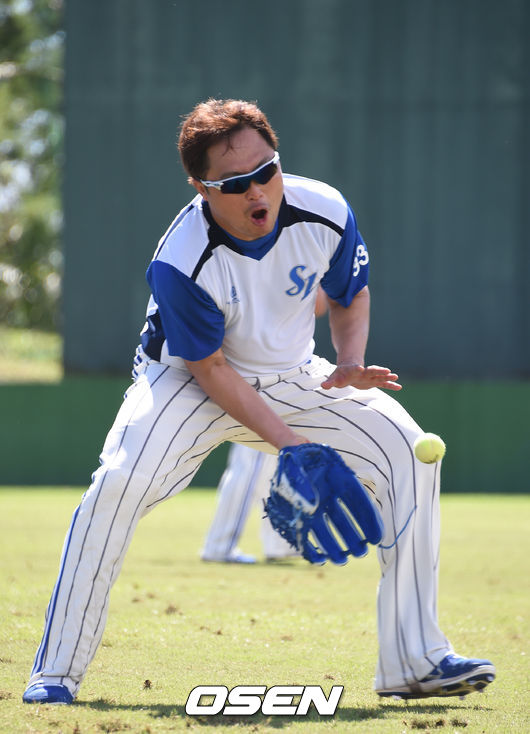 박한이가 테니스 공을 이용한 수비훈련에 임하고 있다.
