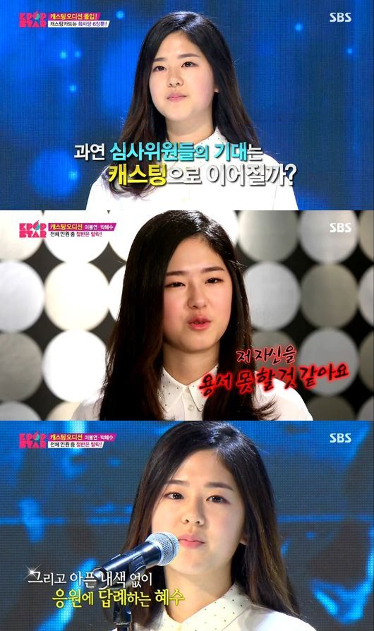 ‘봉잡았수’ 박혜수, 이봉연은 18일 방송된 SBS 예능프로그램 ‘일요일이 좋다-K팝스타4’(이하 ‘K팝스타4’)에서 이문세의 ‘빗속에서’를 듀엣곡으로 소화했다. 박혜수는 이날 장염과 독감으로 최악의 컨디션에 임해 듀엣을 이룬 이봉연의 걱정을 샀다.
