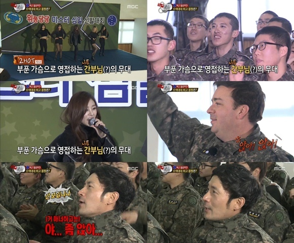 이날 멤버들은 수색대대 최고 몸짱을 찾는 행사에 참여했다. 사회자를 맡은 김수로는 트레이너 숀리와 지나를 소개했다. 숀리가 등장할 때와 달리 지나가 등장하자 병사들의 함성은 폭발적이이었다.