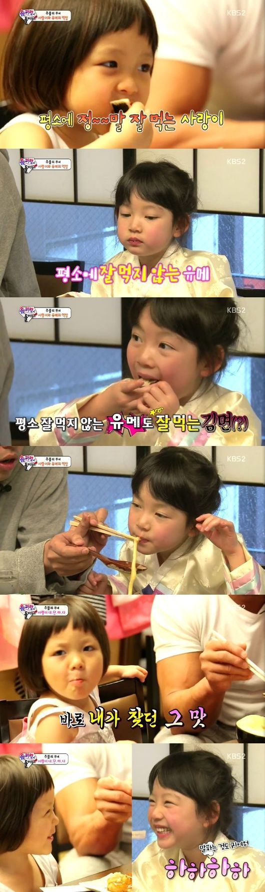 사랑과 유메는 18일 오후 방송된 KBS 2TV 예능프로그램 '해피선데이-슈퍼맨이 돌아왔다'(이하 '슈퍼맨')에서 메밀김말이와 낫토 우동 '먹방'을 선보였다.