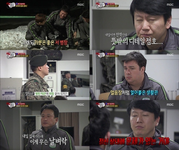 김수로와 서경석, 샘 해밍턴은 전역을 앞두고 군화를 손질하는 등 군대에서의 마지막 밤을 보냈다. 하지만 뜻하지 않게 생활관 정리가 제대로 이뤄지지 않아서 점호에서 얼차려를 받게 됐다.