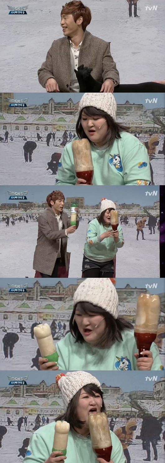'코미디 빅리그' 이국주가 남자친구 김여운이 선물한 막걸리-맥주 아이스크림을 받아들고 행복해 했다.