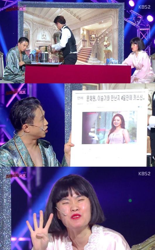 이어 박성광은 "이승기 기사 났더라. '문채원과 4일만에 키스'"라고 기사를 보여줬다. 박지선은 "4일? 난 4분 걸렸다. 승기 키스, 나한테 배운 거다"고 말했다.