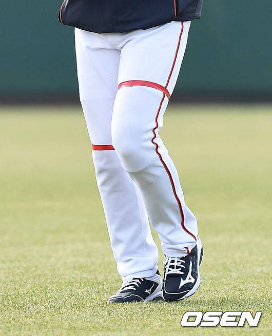 한화 캠프를 보면 몇몇 선수들의 유니폼에 밴드처럼 붙어있는 빨간색 테이프를 볼 수 있다. 두꺼운 전기테이프를 종아리·무릎·허벅지에 둘러서 붙였다. 멀리서 보면 유니폼의 선처럼 느껴질 정도. 이 테이프 정체는 바로 선수 몸 상태를 알리는 일종의 적색신호다.