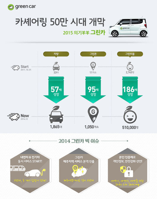 이에 따르면 그린카는 지난 2011년 10월 1일 대한민국 최초로 카셰어링 서비스를 시작, 론칭 3년여 만에 놀라운 성장을 거뒀다. 론칭 당시 33대였던 차량보유대수는 2014년 12월 기준 1865대로 57배 성장했고, 그린카의 회원인 그린피플은 2745명에서 51만 명으로 186배 늘어났다. 또 그린카 차고지인 그린존은 11개소에서 1050개소로 95배 성장하여 국내 카셰어링 서비스 활성화를 견인했다.