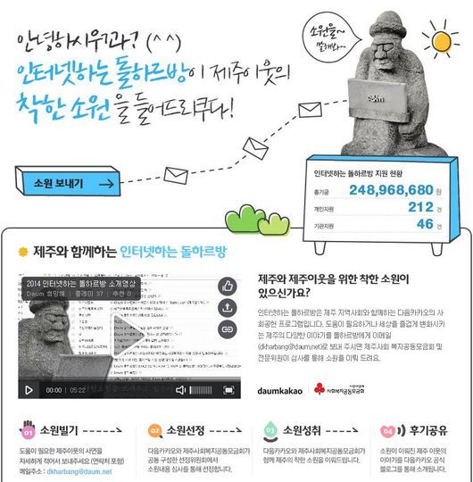 2008년에 시작한 '인터넷하는돌하르방'은 도움이 필요한 제주 이웃의 사연을 인터넷에 올리면 착한 소원을 들어주는 지역공헌사업이다. 다음카카오는 현재까지 개인 212건, 단체 46건 등 총 258건의 소원을 후원해오고 있다.