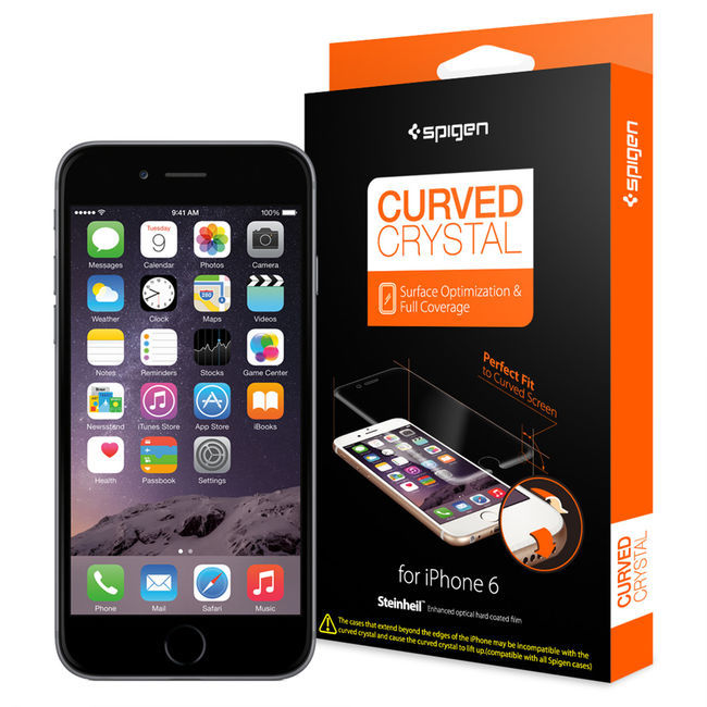 '커브드크리스탈'은 슈피겐만의 곡면성형기술을 도입해 일반 필름이 덮지 못한 아이폰6의 테두리까지 완벽하게 커버하는 액정보호필름이다. 특히, 아이폰의 곡면 각도와 정확히 일치되는 디자인과 최적의 라인설계로 케이스와 함께 사용 시 필름이 밀리거나 들뜨는 현상 없이 오랜 시간 깨끗하게 액정을 보호해준다. 높은 투과율로 선명한 화면을 선사하며, 섬세하고 빠른 터치반응을 제공한다는 장점도 있다.