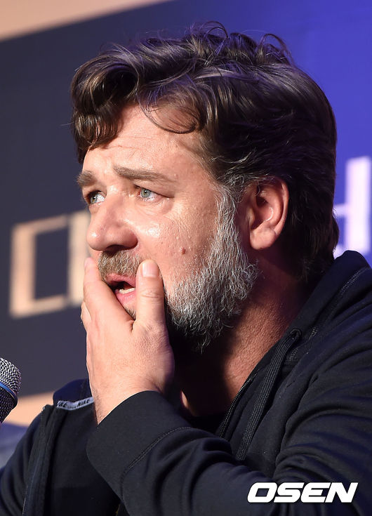 할리우드 배우 러셀 크로우가 질문을 듣고 있다.