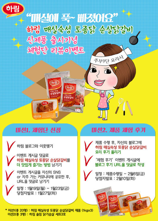 '하림 매실숙성 토종닭 순살닭갈비' 제품 증정, 레시피 소개 기회도 마련