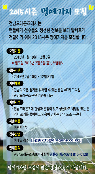 전남 드래곤즈(사장 박세연)가 선수단 동정 및 경기 결과 등 구단 소식을 팬들에게 발 빠르게 전달하기 위해 2015년 명예기자를 모집한다.