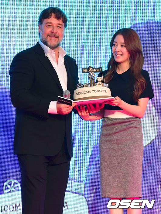 할리우드 배우 러셀 크로우가 19일 오후 서울 자양동 롯데시네마 건대입구에서 진행된 영화 '워터 디바이너' 레드카펫 행사에 참석해 배우 이세영에게 케이크 선물을 건네받고 있다.