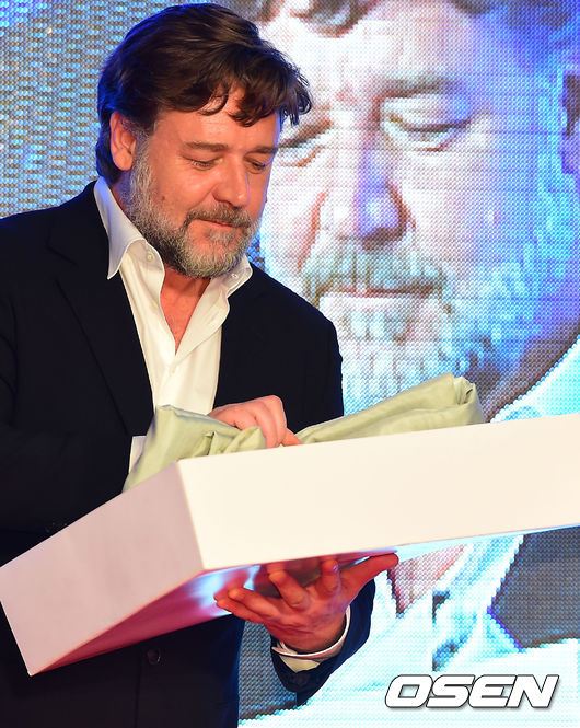 할리우드 배우 러셀 크로우가 19일 오후 서울 자양동 롯데시네마 건대입구에서 진행된 영화 '워터 디바이너' 레드카펫 행사에 참석해 한복 선물을 받고 있다.