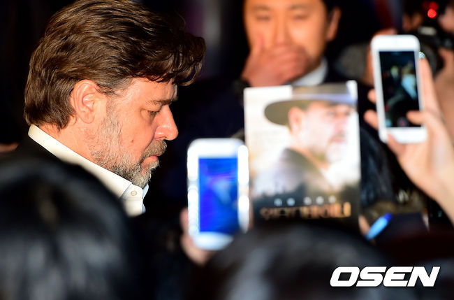 할리우드 배우 러셀 크로우가 19일 오후 서울 자양동 롯데시네마 건대입구에서 진행된 영화 '워터 디바이너' 레드카펫 행사에 참석해 팬들과의 만남을 갖고 있다.