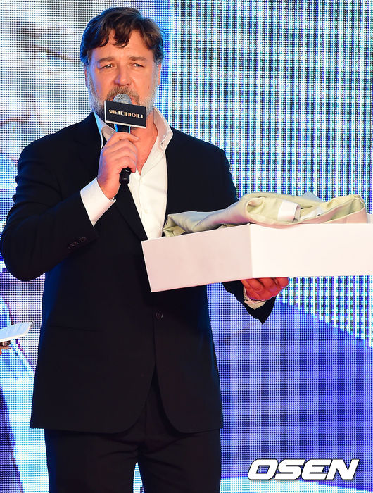 할리우드 배우 러셀 크로우가 19일 오후 서울 자양동 롯데시네마 건대입구에서 진행된 영화 '워터 디바이너' 레드카펫 행사에 참석해 팬들에게 인사말을 전하고 있다.
