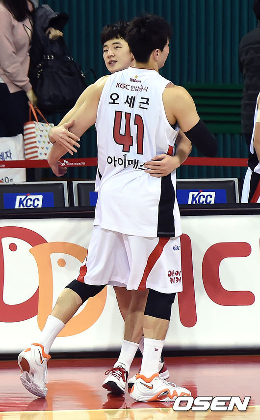 승리를 거둔 KGC 오세근과 강병현이 포옹을 나누고 있다. / youngrae@osen.co.kr