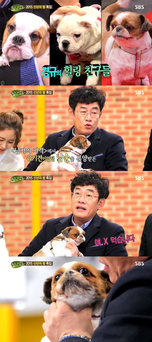 이경규는 프랑스 불도그 뿌꾸와 잉글랜드 불도그 두치를 소개, “‘남자의 자격’에서 유기견이었던 아이를 분양받아 키우는 개다. 장기가 X 먹기”라며 건강한 모습의 남순이를 공개했다.