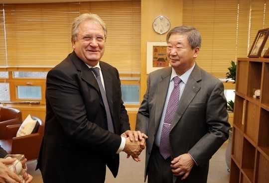 지난해 11월 구본능 한국야구위원회(KBO) 총재를 예방한 리카르도 프라카리 IBAF 회장.