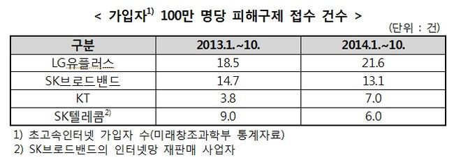 LG유플러스에 이어 가입자 100만 명당 피해가 많은 사업자는 SK브로드밴드(13.1건), KT(7.0건), SK텔레콤(6.0건) 순이었다. SK텔레콤과 SK브로드밴드는 2013년 동기 대비 피해가 감소한 반면 LG유플러스와 KT는 증가한 것으로 나타났다.