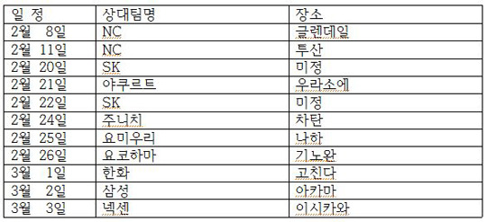 오키나와 2차 캠프는 실전 위주다. 한국팀 SK 한화 삼성 넥센, 일본팀 야쿠르트 주니치 요미우리 요코하마와 상대한다. 오키나와 연습경기에서 선발진 새 얼굴들을 테스트하고, 야수진의 젊은 선수들도 모습을 드러낸다. 총 11번의 연습경기가 끝나면 이틀 후인 3월 5일에 귀국, 3월 7일부터는 시범경기가 시작된다.
