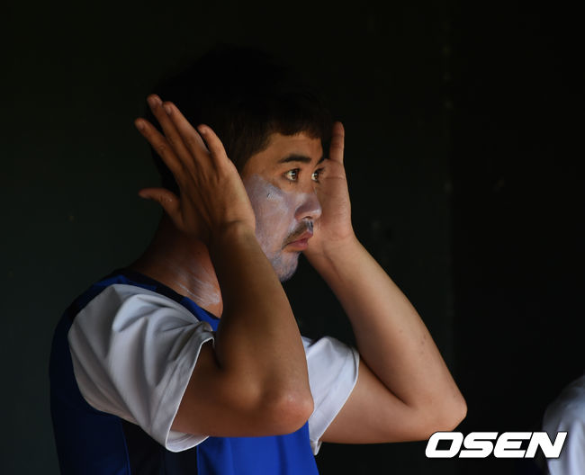 훈련에 앞서 장원삼이 썬크림을 바르고 있다.