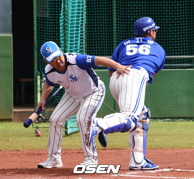 강성우 코치가 이지영 포수의 송구 동작을 수정 시키고 있다.