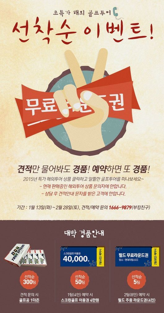 먼저 선착순 300팀을 대상으로 견적만 받아도 골프공 1더즌을 100% 제공하며, 선착순 50팀을 대상으로 1팀(4인) 예약 시 스크린골프 이용권 4만 원을 증정한다. 특히 선착순 5팀에 한해서는 2팀(8인) 예약 시 필드 무료 라운드권(4인)이 주어진다.