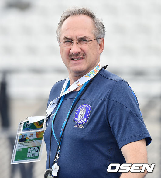 슈틸리케 감독이 훈련장으로 들어서며 얼굴을 찡그리고 있다.