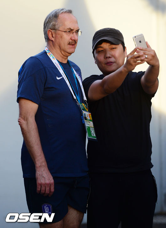 슈틸리케 감독이 훈련을 마치고 훈련장에서 나오며 한국 교민 팬과 셀카를 찍고 있다.