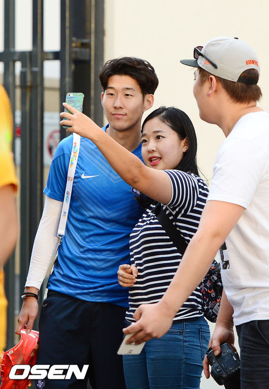 손흥민이 훈련을 마치고 훈련장에서 나오며 한국 교민 팬과 셀카를 찍고 있다.