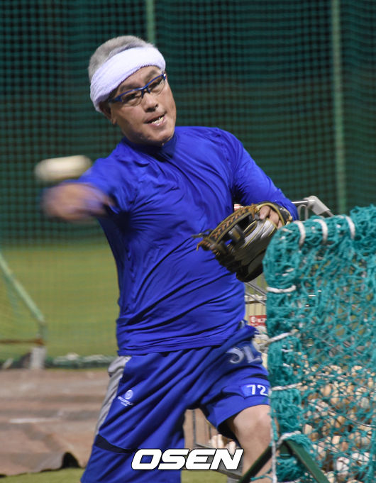 양일환 코치가 선수들의 타격 훈련을 위해 배팅볼을 던져주고 있다.