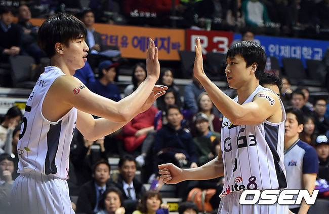 4쿼터 LG 김종규가 바스켓 카운트를 얻어낸 뒤 김영환과 기뻐하고 있다.