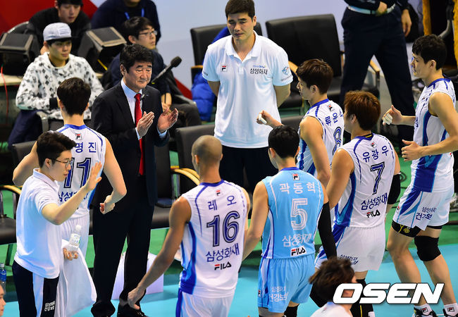 2세트, 삼성화재 삼성화재 신치용 감독이 작전타임을 마치고 들어오는 선수들을 격려하고 있다.