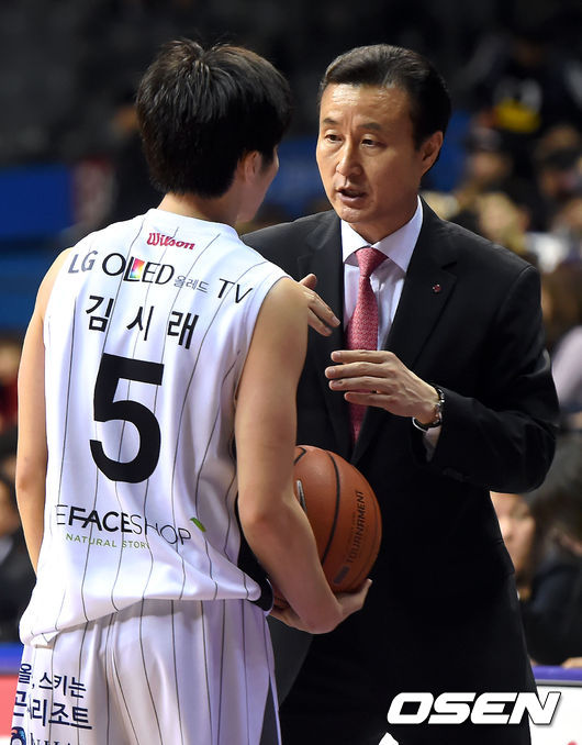 4쿼터 LG 김진 감독이 김시래에게 작전 지시를 하고 있다./ youngrae@osen.co.kr